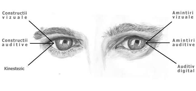 In sus spre stānga inseamna ca persoana respectiva acceseaza amintiri vizuale. Atunci cand te gandesti la un anumit moment sau eveniment, vei observa ca traiectoria ochilor in cea mai mare parte din cazuri este cea descrisa mai sus. Ce culoare are usa ta de la intrare? In sus spre dreapta acceseaza constructie vizuala. Construiesti o imagine vizuala. Gandeste-te cum ar fi sa stai la soare pe o insula unde nisipul este foarte fin, valurile ... Cum arata un cal verde? Spre urechea stanga - amintire auditiva. Care este melodia ta preferata? Spre urechea dreapta - construire auditiva. Cum suna melodia ta preferata interpretata la pian? In jos spre stanga - realizarea unui dialog interior. In jos spre dreapta - accesarea senzatiilor tactile si a emotiilor. |