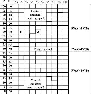 Figura 8 - Distributia puterii intre doua grupuri in cadrul unui organism de adoptare a deciziilor, in functie de reprezentarea grupurilor si de regula de vot. Cifrele din primele doua coloane de la stinga arata distributia reprezentatiei intre grupurile A si B. Cifrele de pe rindul de sus arata numarul de voturi necesar pentru o decizie si se intinde de la majoritatea simpla (55%) pina la unanimitate (100%). PV corespunde "puterii de veto".