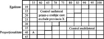 membrii provinciei au posibilitatea unei alegeri limitata intre (a) proportionalitate combinata cu o regula a majoritatii simple (v. figura 9, intersectia A) si (b) egalitatea combinata cu putere de veto (v. figura 9, intersectia B). Prima optiune, care, teoretic, da mai multe voturi grupului, il priveaza de puterea de veto; cea de a doua, ii da cu mult mai putine voturi, in schimb ii confera putere de veto. Ce vor alege membrii acestei provincii? Se poate specula ca daca motivatia dominanta ar fi de a maximiza controlul efectiv al in-group-ului, ei ar trebui sa aleaga egalitatea, insa daca motivatia dominanta va fi de a diferentia intre in-group si celelalte provincii, ei vor alege proportionalitatea care, in fapt, ii priveaza de puterea efectiva! Acest exemplu ilustreaza faptul ca marirea numarului de reprezentanti ai unui grup nu antreneaza, in mod necesar, o marire a gradului sau de control decit atunci cind acest numar depaseste jumatate din total.