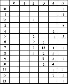 Figura 10 - Numarul de voturi necesare pentru a lua o decizie comuna specificat pe grup. Cifrele din matrice indica numarul de subiecti care au ales fiecare combinatie. Cifrele de pe rindul de sus arata numarul de voturi necesare de la grupul minoritar (maximum 5), iar cifrele din prima coloana din stinga arata numarul de voturi necesare de la grupul majoritar (maximum 13). Remarcati concentratia optiunilor in cadranul care cere fiecarui grup o majoritate a voturilor (dreapta jos).