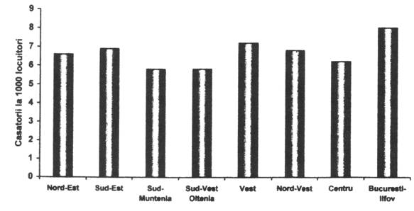 In anul 2004, la nivelul regiunilor de dezvoltare, numarul casatoriilor la 1000 locuitori a oscilat intre 5,8‰ (regiunea Sud-Muntenia si Sud-Vest Oltenia) si 8,0‰ (regiunea Bucuresti-Ilfov).