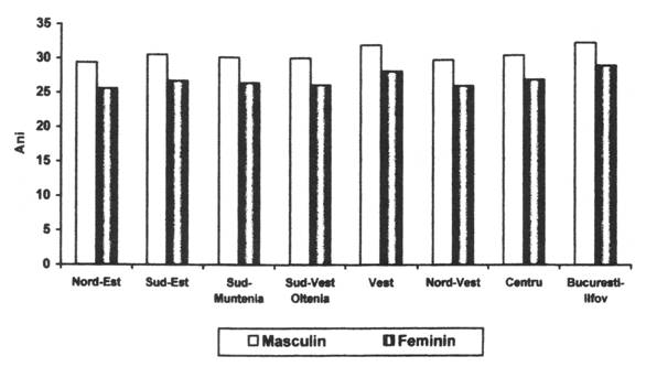 Figura nr. 2. Varsta medie la casatorie pe regiuni de dezvoltare si sexe, in anul 2004