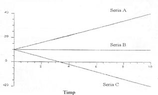 Tendinta reprezinta fluctuatia sistematica a valorilor observate in timp. In figura 1.3. seria A, evidentiaza o tendinta pozitiva a datelor, seria C o tendinta negativa iar in seria B se constata absenta tendintei.
