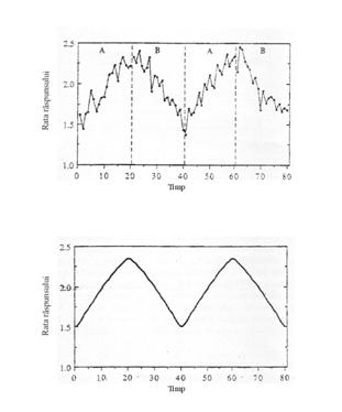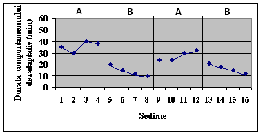 Pentru a testa aceasta ipoteza s-a utilizat designul ABAB in care in cadrul fazei de baza (A), profesorul acorda atentie ori de cate ori fetita manifesta comportamente indezirabile. In conditia (B), faza de interventie a implicat o procedura diferita de intarire in care profesorul acorda atentie si sprijin copilului ori de cate ori se angaja in studiu, dar evita sa-i acorde atentie cand manifesta comportamente indezirabile . Inregistrarea datelor s-a realizat in cadrul unor sedinte cu durata de o ora in acelasi moment al zilei, variabila dependenta constand in numarul de minute din cadrul unei ore in care comportamentul se manifesta. Prin replicarea celor doua faze s-a dovedit astfel impactul intaririlor sociale asupra mentinerii unui comportament indezirabil si rolul acelorasi intariri asupra posibilitatii de a dezvolta comportamente adaptative. (figura 1. 8).