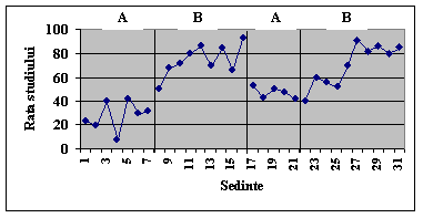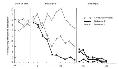 Intr-un studiu efectuat de Hall (1968), s-a urmarit influenta pe care utilizarea unor tehnici comportamentale o are asupra ratei studiului la subiectii hiperactivi.(figura 1.9). Graficul indica procentajul de timp in cadrul orei de curs in care subiectul este implicat in studiu. In faza de baza comportamentul fluctueaza dar nu depaseste 45%. In faza de interventie, acordarea de catre profesor a unor intariri pozitive (lauda), determina cresterea procentajului pana la 90%. Retragerea acestor intariri (faza reversibila), determina reducerea studiului, fara a se atinge nivelul de baza initial. Revenirea la faza de interventie determina restabilirea unui nivel de performanta ridicat.