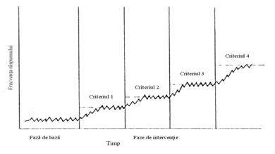 Acest tip de design este utilizat in special in cazurile in care se estimeaza o modificare gradata a variabilei dependente sub impactul variabilei independente. In acest sens, controlul experimental este asigurat prin inregistrarea tendintei de variatie a comportamentului in conditiile fixarii unor criterii din ce in ce mai stricte de administrare a variabilei independente. Astfel, consecutiv stabilirii unui nivel de baza se include o faza de interventie in cadrul careia experimentatorul stabileste un criteriu de performanta pe care il impune subiectului. Odata ce acest criteriu a fost atins se recurge la schimbarea sa, apelandu-se astfel, din aproape in aproape la niveluri din ce in ce mai ridicate ale acestuia. (figura 1.10).