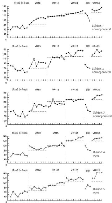 In cadrul unui studiu vizand dezvoltarea comportamentelor de practicare a exercitiilor fizice la subiecti normoponderali sau obezi s-a utilizat ca activitate pedalarea la ergobicicleta. In cadrul fazei de baza subiectilor li s-a precizat faptul ca pot pedala in ritmul pe care il doresc. In cadrul fazei de interventie s-a fixat la inceput un nivel al performantei usor mai crescut (mai ridicat cu 15% decat cel anterior) pentru care subiectii erau recompensati. Atunci cand subiectul atingea nivelul fixat se activa un semnal auditiv ce semnaliza performanta. Odata ce acest nivel era atins si era mentinut de subiect, se introducea un criteriu din ce in ce mai strict de acordare a intaririi (subiectul era recompensat pentru un nivel al performantei mai mare cu 30%, iar apoi cu 45%). Efectul interventiei este prezentat in figura 1.11, in care se constata performanta obtinuta de 5 subiecti (3 normoponderali si 2 obezi ), in cadrul experimentului. Pentru fiecare subiect, consecutiv atingerii performantei maxime s-a introdus o faza reversibila in care nu s-au mai acordat intariri. In aceste conditii s-a constatat o usoara reducere a performantei (ceea ce constituie un argument suplimentar in favoarea efectului interventiei realizate). Reintroducerea interventiei in conditiile fixarii criteriului atins anterior a condus rapid la reinstalarea nivelului de performanta prealabil.