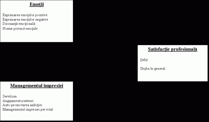 Am reusit sa integram astfel principalele caracteristici ale variabilelor incluse in studiu. Scopul nostru explicit este acela de a investiga un model original care sa inglobeze toate cele trei dimensiuni mentionate anterior(emotiile aferente muncii, managementul impresiei si satisfactia profesionala), datorita faptului ca in literatura de specialitate nu am putut identifica inca unul.