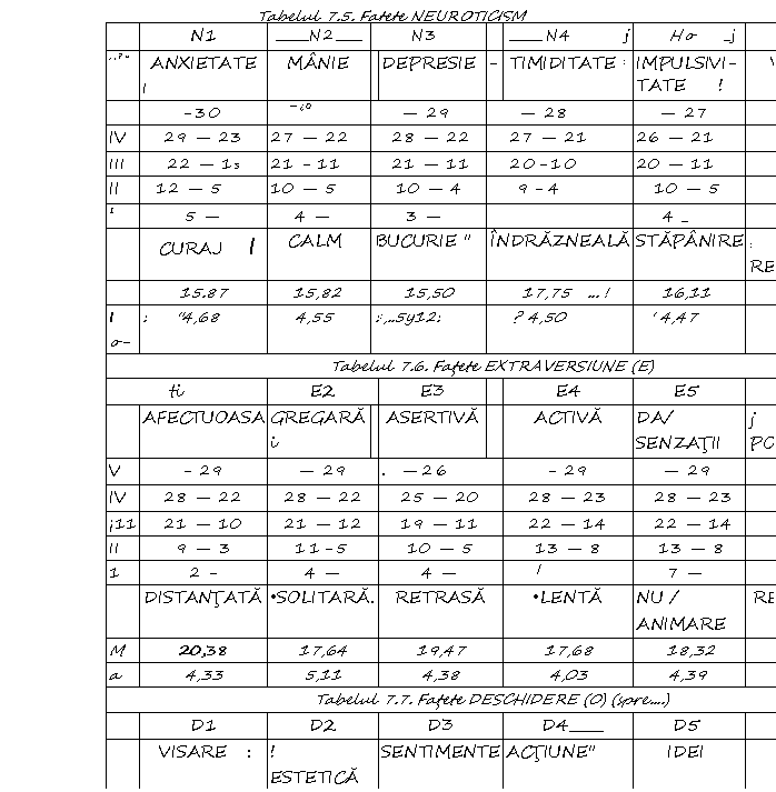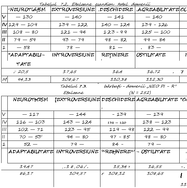 „NEO PI -R'(N = 478) NEUROTICISM EXTROVERSIUNE DESCHIDERE AGREABILITATE f CONSTIINTA V IV III II c ADAPTABILITATE INTROVERSIUNE. • RETINERE OSTILITATE HEDONISM :a M l Tabelul 7.2. Etaloane esantion total