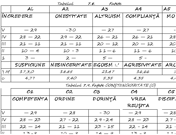 CONSTIINCIOZITATE (C) c1 c2 c3 c4 c5 c6 competenta ordine dorinta vrea reusita disciplinat- deliberare V IV III II nesiguranta dezordine dezinvolt nepasator nemotivat' •precipitare ' ■M j <*■; ' Tabelul Fatete AGREABILITATE (A)