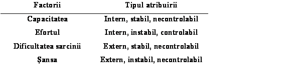 Persoanele isi explica efectele/ rezultatele pe baza unei scheme de clasificare cu patru factori si trei dimensiuni (intern - extern; stabil - instabil; controlabil - necontrolabil).