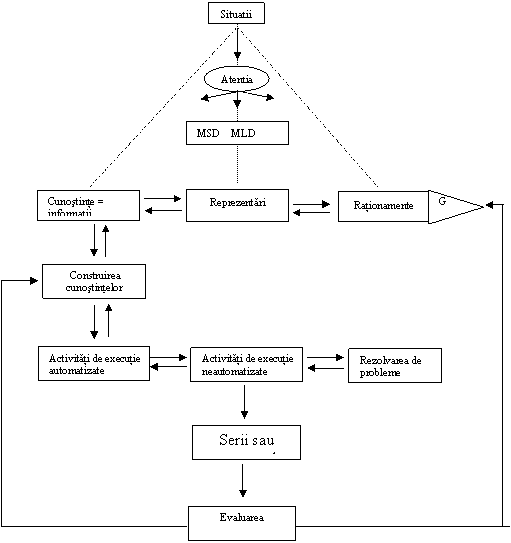 In schema anterioara situatiile cuprind informatii materiale dar si informatii simbolice atat generale cat si specifice. Prin cunostinte se inteleg de fapt cunostintele generale, atat relationale cat si procedurale precum si cunostintele specifice, referitoare la evenimente, situatii, suite de actiuni. Reprezentarile sunt acele imagini mintale corespunzatoare situatiilor materiale dar si reprezentarile simbolice (abstracte, specifice). Notiunile sunt actiuni mintale condensate. Prin rationamente se au in vedere atat rationamentele epistemice (inductia si deductia) cat si rationamentele pragmatice (euristice, de planificare si programare a actiunilor).