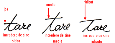 Imaginea de sine se identifica in scris in litera t, mai precis in bara literei t. Cu cat bara este trasata mai spre varful literei cu atat persoana are o imagine de sine mai buna.