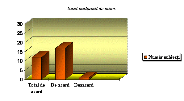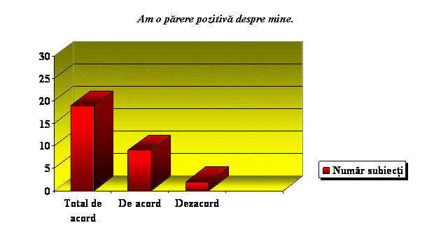 În acest sens, la chestionarul "Stima de sine", 23 din cei 30 elevi nu sunt de acord cu ideea ca ei "nu valoreaza nimic", iar 17 dintre ei au "respect fata de sine".