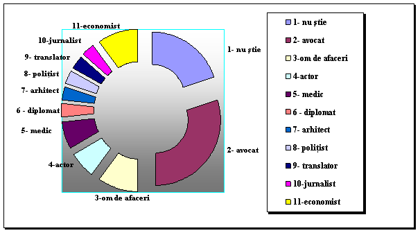 Pe primele cinci locuri, în ordinea importantei, elevii opteaza pentru urmatoarele profesii: avocat, om de afaceri, economist, medic si diplomat.