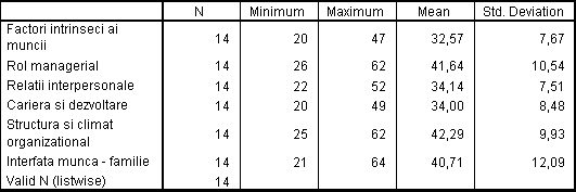 Exista o corelatie semnificativa negativa între predictorul "Rol managerial" si "Influenta personala", cu un coeficient de corelatie de -,595 si un prag de semnificabilitate statistica de 0,05. Aceasta înseamna ca atunci când creste cantitatea de presiune pe care o persoana o (re)simte ca rezultat al responsabilitatii pentru managementul si supervizarea altor persoane, va descreste si masura în care cineva este capabil sa îsi exercite libertatea de decizie la locul de munca (tabel 5.18.).
