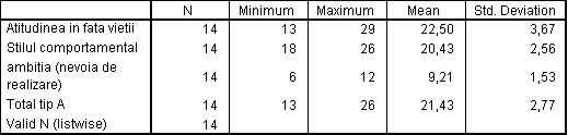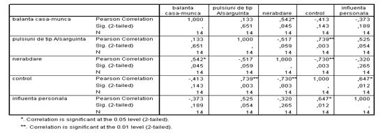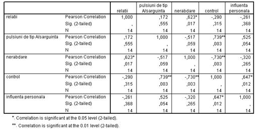 Tabel 5.17. Corelatia dintre Responsabilitatea personala" si "Pulsiune de tip A", "Nerabdarea", "Control", si "Influenta personala".