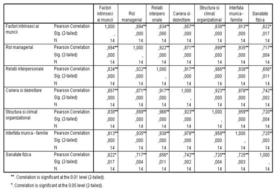 "Interfata munca-familie" coreleaza pozitiv cu "Sanatatea fizica", având un coeficient de corelatie de ,725 si un prag de semnificabilitate statistica de 0,01, indicându-ne faptul ca atunci când persoana reuseste sa se deconecteze de la presiunea de la locul de munca când se afla acasa si invers, si starea de sanatate fizica va fi mai buna (tabel 5.23.).