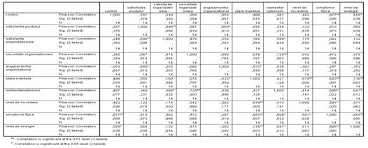 Predictorul "Control" coreleaza pozitiv si cu "Nivelul de energie", coeficientul de corelatie fiind ,555, iar pragul de semnificabilitate statistica de 0,05, ceea ce înseamna ca daca va creste masura în care o persoana se simte capabila sa influenteze si sa controleze evenimentele, atunci va creste si cantitatea de energie simtita de persoana (tabel 5.21.).