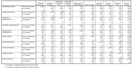 "Interfata munca-familie" coreleaza pozitiv cu "Sanatatea fizica", având un coeficient de corelatie de ,725 si un prag de semnificabilitate statistica de 0,01, indicându-ne faptul ca atunci când persoana reuseste sa se deconecteze de la presiunea de la locul de munca când se afla acasa si invers, si starea de sanatate fizica va fi mai buna (tabel 5.23.).