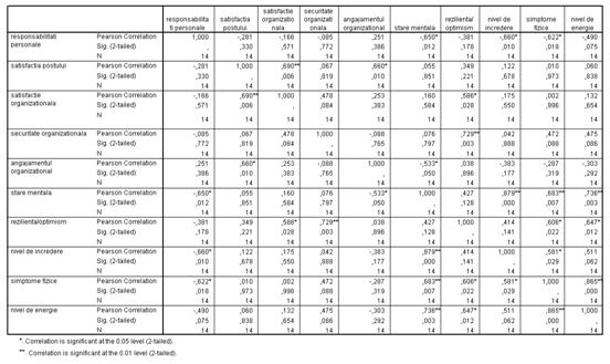 "Responsabilitatea personala" coreleaza negativ cu "Nivelul de încredere personala", având un coeficient de corelatie de -,660, cu un prag de semnificabilitate statistica de 0,05, aceasta însemnând ca atunci când creste cantitatea de presiune pe care o persoana o (re)simte ca rezultat al asumarii responsabilitatii pentru actiunile si deciziile proprii, cantitatea de energie simtita de persoana scade semnificativ (tabel 5.12.).