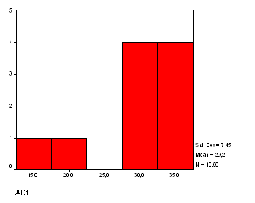 Media celei de a treia variabile (AD1, atentia distributiva la subiecti normali) este 29,2. Valoarea minima este de 14, iar valoarea maxima este de 36. S-a obtinut o mediana de 31, iar abaterea standard este 7,45. Acest lucru însemnând ca valorile acestei variabile se vor încadra în intervalul 31 + 7,45 si 31 - 7,45.