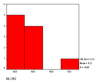 La variabila MLVB2, respectiv memoria de lucru verbala la subiectii cu discalculie s-a obtinut o medie a rezultatelor brute de 47,8. Valoarea minima este 35,0, adica valoarea cea mai mica pe care a avut-o MLVB2. MLVB2 a fost testata cu proba elaborata de Baddeley. În aceasta proba s-a urmarit numarul cuvintelor reproduse în urma ascultarii lor si nu vizualizarii acestora. Astfel, valoarea maxima (71,0) reprezinta numarul maxim de reproducere a cuvintelor de catre subiectii normali. Abaterea standard reprezinta împrastierea punctelor în jurul medianei. Valoarea abaterii standard în ceea ce priveste memoria verbala la subiectii normali este de 9,73. Ţinând cont ca valoarea medianei (valoarea de mijloc) este 44,5 am putea întocmi un grafic cu împrastierea valorilor de la mediana. Variabila are valori în intervalul 44,5 + 9,73 si 44,5 - 9,73.
