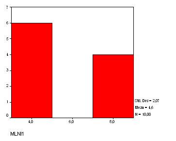 MLNI1 reprezinta memoria de lucru numerica indirecta la subiectii normali. Ca si variabila precedenta MLNI1 a fost testata cu proba numerica, dar indirecta din testul WISC. Scorurile reprezinta, de asemenea câte numere au fost capabili sa reproduca subiectii din un numar de 7 serii în urma ascultarii lor. Media acestor reproduceri este de 5,0, iar valoarea maxima este de 7, în timp ce valoarea minima este de 3. S-a obtinut o mediana de 5,00 si o abatere standard de 2,10, valorile variabile încadrându-se astfel în intervalul 5,00 - 2,10 si 5,00 + 2,10.