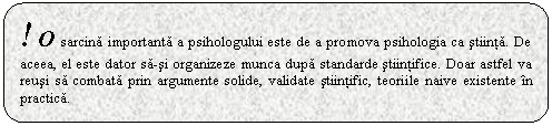 O sarcina importanta a psihologului este de a promova psihologia ca stiinta. De aceea, el este dator sa-si organizeze munca dupa standarde stiintifice. Doar astfel va reusi sa combata prin argumente solide, validate stiintific, teoriile naive existente īn practica.