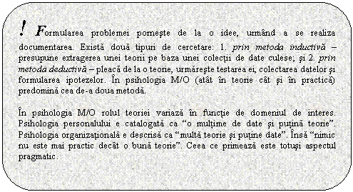 Formularea problemei porneste de la o idee, care trebuie apoi documentata. Exista doua tipuri de cercetare: 1. metoda inductiva - presupune extragerea unei teorii pe baza unei colectii de date culese; si 2. metoda deductiva - pleaca de la o teorie, urmareste testarea ei, colectarea datelor si formularea ipotezelor. Īn psihologia M/O (atāt īn teorie cāt si īn practica) predomina cea de-a doua metoda.