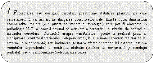 (2) Nivelul de control al mediului de cercetare. Succesul unei investigatii depinde de veridicitatea datelor care se obtin. Din acest motiv cercetatorii sunt preocupati de controlul situatiei experimentale si eliminarea tuturor sau īn mare masura a factorilor care ar putea produce distorsionarea rezultatelor. Modalitatile de control sunt numeroase. Dintre formele de control utilizate amintim: (a) manipularea (controlul exercitat de cercetator prin operarea la nivelul variabilei independente - tipul de feedback utilizat, sursele de comunicare apelate, utilizarea unor stiluri de conducere diferite etc.); (b) eliminarea sau includerea (cercetatorii sunt preocupati de identificarea si izolarea unor variabile externe care pot facilita confundarea efectelor variabilelor independente. Un mod de a elimina o variabila este prin convertirea ei la o constanta - variabile ca zgomotul, luminozitatea, sexul, vārsta, nivelul de scolarizare etc., pot fi eliminate prin mentinerea lor "constanta"). Controlul prin includere īnseamna introducerea variabilei externe īn experiment astfel īncāt efectele potentiale ale acesteia asupra variabilei dependente sa poata fi studiate. De pilda, sa presupunem ca un cercetator studiaza influenta a diferite surse de comunicare asupra schimbarii atitudinii. El poate presupune ca variabila externa "sex" ar putea distorsiona rezultatele si deci necesita un control aparte. Pentru a controla variabila īn cauza prin eliminare, va proceda la alcatuirea lotului de subiecti numai din barbati sau numai din femei. Controlul variabilei respective prin includere presupune studiul atāt al barbatilor cāt si al femeilor īn contextul unui design factorial; (c) controlul statistic. Obisnuit, variabilele categoriale sunt utilizate pentru a explica si ilustra sensul controlului variabilelor externe. Procedurile de control statistic mai frecvent utilizate sunt analiza de covarianta si corelatia partiala (Pedhazur & Pedhazur, 1991); (d) randomizarea. Este cunoscut faptul ca numarul variabilelor externe care pot fi controlate este relativ mic. Ceea ce se face īnsa adesea este apelarea la tehnicile statistice de randomizare sau de selectie īntāmplatoare, astfel se īncearca evitarea unor serieri sau legitati īn operarea cu variabilele experimentale.