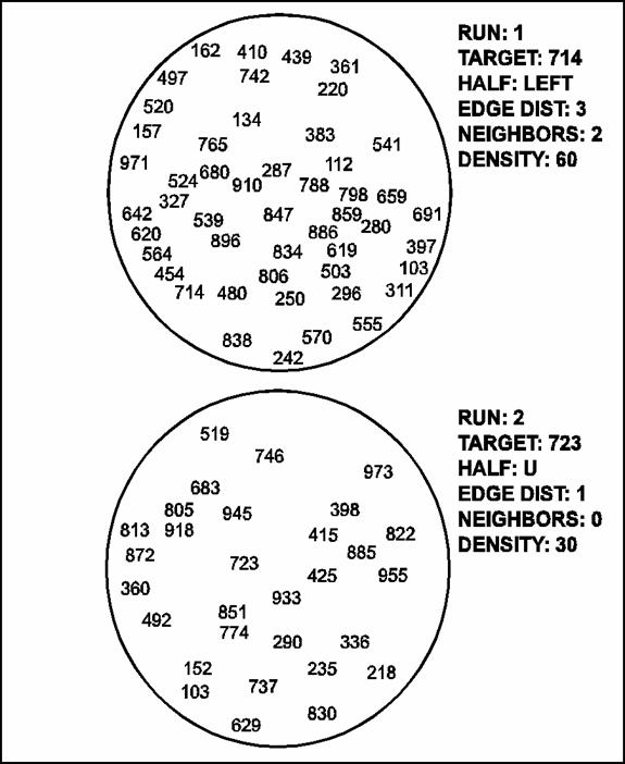 L.Carter (Landy,1985) a proiectat un experiment care s-a desfasurat īn conditii de laborator. El si-a propus sa studieze caracteristicile ecranului de afisare radar care ar putea afecta timpul de cautare al operatorului/subiectului. Īn acest scop a construit un aparat care permitea varierea a doi parametri: numarul de obiecte (prezente īntr-un anumit moment - densitatea) si pozitia relativa a acestor obiecte pe ecran. Densitatea putea fi de 30 si 60 de obiecte-tinta, īn trei conditii de apropiere de bordura ecranului. Obiectele tinta mai puteau avea 0, 1 sau 2 obiecte īnvecinate. Obiectele-tinta pot aparea īn jumatatea superioara sau inferioara a ecranului. Au putut fi imaginate mai multe variante experimentale cu diferite grupuri de subiecti. Īn Figura 2.2 sunt ilustrate doua ecrane radar care au fost prezentate subiectilor.