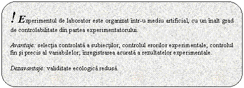 Experimentul de laborator. Experimentele de laborator sunt organizate īn conditii de lucru speciale, obisnuit īn īncaperi amenajate īn acest scop, departe de mediul de munca sau cadrul organizational. Īn laborator, cercetatorul are posibilitatea realizarii unui control sever al variabilelor, mai ales a acelora care tin de conditiile (ambientul) asociate cu observarea reactiilor comportamentale.