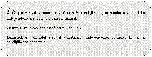 Experimentul de teren. Prin modul de organizare, experimentul de teren se īncadreaza īn cerintele generale ale oricarui experiment. Deosebirea fata de experimentul de laborator consta īn aceea ca se desfasoara īn conditii reale, adica manipularea variabilelor independente are loc īntr-un mediu natural (participantii la experiment nu percep locul unde acesta se desfasoara ca fiind altul decāt cel īn care īsi desfasoara activitatea cotidiana). Ca si īn experimentele de laborator, cercetatorul testeaza efectele cātorva variabile asupra comportamentului subiectului. Deficienta mare este ca īn experimentele de teren, posibilitatile de control ale variabilelor sunt foarte reduse. Daca īn experimentul de laborator, toate variabilele sunt controlate si manipulate, īn cel de teren, din experiment fac parte toate variabilele existente. De fapt, aceasta situatie ofera experimentului de teren un realism sporit.