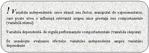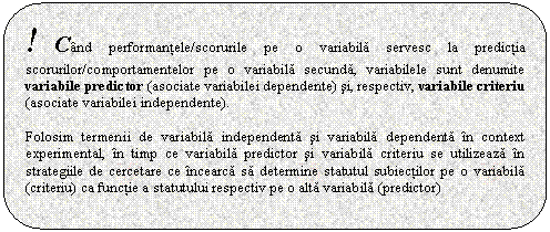 Variabila independenta este orice stimul sau factor, manipulat de experimentator, care poate avea o influenta relevanta asupra unor prestatii sau comportamente (variabila stimul). Variabila dependenta se refera, de regula, la performantele comportamentale (variabila raspuns). Cānd performantele/scorurile pe o variabila servesc la predictia scorurilor/comportamentelor pe o variabila secunda, variabilele sunt denumite variabile predictor (asociate variabilei dependente) si, respectiv, variabile criteriu (asociate variabilei independente). Folosim termenii de variabila independenta si variabila dependenta īn context experimental, īn timp ce variabila predictor si variabila criteriu se utilizeaza īn orice strategie de cercetare.