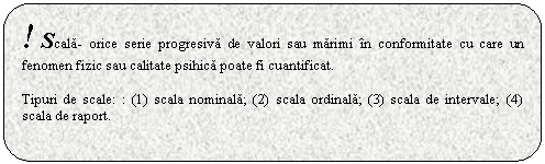 Definim scala orice serie progresiva de valori sau marimi īn conformitate cu care un fenomen fizic cu calitate psihica poate fi cuantificat. Exista mai multe tipuri de scale: scala nominala, scala ordinala, scala de intervale, scala de raport.