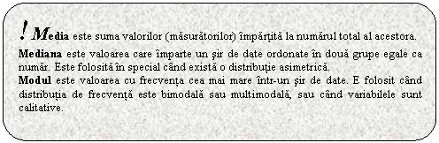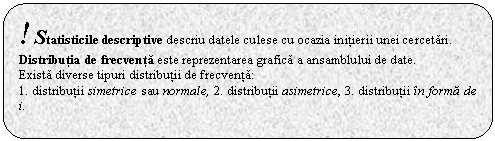 Indicii statisticii studiati se refera la masurari ale tendintei centrale (media, mediana, modul), la determinarea variabilitatii (rangul, dispersia si abaterea standard) si simetria distributiei. Sunt modalitati uzuale de descriere a formei distributiei datelor si alcatuire a ceea ce se numeste rezumatul statistic al cercetarii.