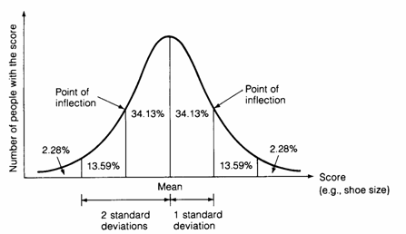 Īn exemplul din Tabelul 2.4, unde AS = 3.94 si M = 20, putem calcula ±1s scazānd si adunānd la medie valoarea abaterii standard. Deci, 20 + 3.94 = 23.94 si 20 - 3.94 = 16.06. Deci, īntre limitele de 23.94 si 16.06 sunt cuprinse 68.27% dintre valorile date, sau 2/3 dintre subiecti au obtinut la proba de timp de reactie rezultate care variaza īntre 23.94 si 16.06 sutimi de secunda. Īntr-o distributie normala, ±2s acopera circa 95.44% si ±3s, 99.72%. din suprafata de sub curba sau din numarul total de observatii.