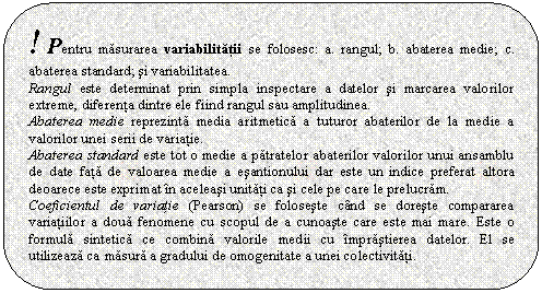 Daca V este cuprins 0 - 15%, rezulta ca īmprastierea datelor este mica si media este reprezentativa; īntre 15 - 30%, īmprastierea este mijlocie si media suficient de reprezentativa; peste 30 - 33%, media colectivitatii nu este reprezentativa din cauza neomogenitatii (Novak, 1988).
