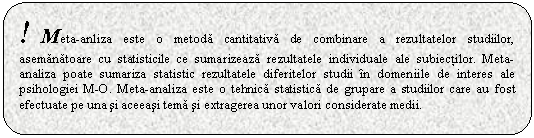 Meta-analiza este o alta tehnica de lucru pe care psihologii o utilizeaza tot mai frecvent. Este cunoscut faptul ca revistele de specialitate abunda de cercetari care, de fapt, acopera una si aceeasi tematica. Exista astfel sute de studii efectuate pe problema stresului ocupational. La acestea, esantioanele sunt diferite, instrumentele de cercetare difera si ele, mediul de cercetare este diferit etc. Validarea acelorasi teste psihologice provenite din arsenalul clasic, se repeta cu ocazia a diferite studii efectuate īn contexte organizationale diferite. Pe buna dreptate, psihologul se poate īntreba care din aceste studii este bine sa-l ia īn considerare? Se poate el opri asupra studiului care i se pare ca este "cel mai bun" sau poate ca este mai bine sa sintetizeze toate studiile derulate pe o aceeasi tema si sa obtina niste valori medii la care sa se refere ca la o concluzie generala? Meta-analiza este o metoda cantitativa de combinare a rezultatelor studiilor, asemanatoare cu statisticile ce sumarizeaza rezultatele individuale ale subiectilor (Hunter & Schmidt, 1990; Rosenthal, 1991). Meta-analiza poate sumariza statistic rezultatele diferitelor studii īn domeniile de interes ale psihologiei M-O. Asemenea analize pot fi simple descrieri sumative (sintetice) ale rezultatelor sau proceduri matematice foarte complexe si proceduri statistice. Meta-analiza este o tehnica statistica de grupare a studiilor care au fost efectuate pe una si aceeasi tema si extragerea unor valori considerate medii. Poate cea mai simpla forma de meta-analiza sintetizeaza rezultatele studiilor multiple prin intermediul valorilor medii. O meta-analiza ar putea descoperi o corelatie medie īntre doua variabile, aceasta avānd o valoare particulara de .40. De exemplu, presupunānd ca cinci studii au evidentiat urmatoarele corelatii īntre satisfactia profesionala si nivelul de salarizare: .20, .22, .24, .26, .28. O simpla meta-analiza a acestor studii ar indica o corelatie medie īntre aceste variabile de .24. Analize mai complexe ar putea fi conduse īn sensul explorarii altor aspecte ale acestor studii. Daca unele studii ar fi realizate pe manageri si altele pe nonmanageri s-ar putea vedea daca corelatiile dintre cele doua tipuri de angajati sunt diferite (Spector, 2000). Landy (1989) apreciaza ca īn anii care vor urma, meta-analiza va deveni una dintre tehnicile cele mai uzuale de inferenta si construire a teoriilor psihologice. O aplicatie specifica a meta-analizei īn psihologia M-O, este validitatea generalizata. Ea presupune realizarea unei analize statistice īn scopul determinarii daca diferentele dintre patternurile obtinute cu ocazia unor masuratori (testari) diferite, se aseamana īntre ele.