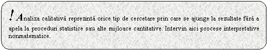 Analiza calitativa. Prin cercetarea calitativa īntelegem orice tip de cercetare prin care se ajunge la rezultate fara a apela la proceduri statistice sau alte mijloace cantitative (Strauss & Corbin, 1998). Referirile se fac la evenimente de viata, experiente personale, comportamente, emotii sau eficienta organizationala, analiza (diagnoza) unei organizatii, miscari sociale, interactiuni culturale etc. Referindu-ne la analiza calitativa a datelor, avem īn vedere procesele interpretative nonmatematice desfasurate cu scopul descoperirii unor concepte si relatii īn datele brute colectate si organizarea lor īn scheme explicative teoretice. Datele supuse analizei calitative pot proveni din interviuri si observatii, documente, filme si benzi video, dar si date cuantificate pentru alte scopuri cum ar fi recensamintele. Īn psihologia M-O analiza calitativa a datelor este utilizata īn multe interventii, cum ar fi studiul incidentelor critice sau expertizarea accidentelor de munca sau a erorilor. De asemenea, īn diagnoza organizationala multi psihologi fac apel la tehnicile analizei calitative a datelor.