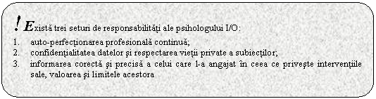 Activitatea īn care psihologii M-O sunt cel mai adesea implicati este aceea de evaluare si testare. Astfel, psihologii M-O sunt confruntati cu evaluari ale cursantilor care au parcurs un stagiu de instruire, cu evaluarea performantelor sau cu evaluarea aptitudinilor prin teste si probe de personalitate. Se considera ca īn legatura cu domeniile de evaluare mentionate ar exista trei seturi de responsabilitati (Landy, 1989). Una se refera la profesia de psiholog si sustine necesitatea prestarii unor servicii de calitate. Pentru aceasta, psihologul M-O trebuie sa fie preocupat de pregatirea sa profesionala continua. El are obligatia sa-si īnsuseasca noile progrese pe care le-a īnregistrat psihologia īn general, psihologia M-O, īn special. Ne referim aici la teoriile noi care se vehiculeaza, la instrumentele de interventie si mijloacele de evaluare. Responsabilitatea psihologului este deci sa fie la curent cu tot ce profesia sa īi ofera, aceasta mai ales īn directia sa de competenta sau aplicatie. Discutiile cu colegii, studiul literaturii de specialitate si participarile la conferinte si congrese, constituie mijloace prin care se realizeaza acest deziderat.
