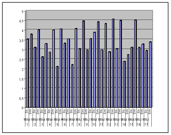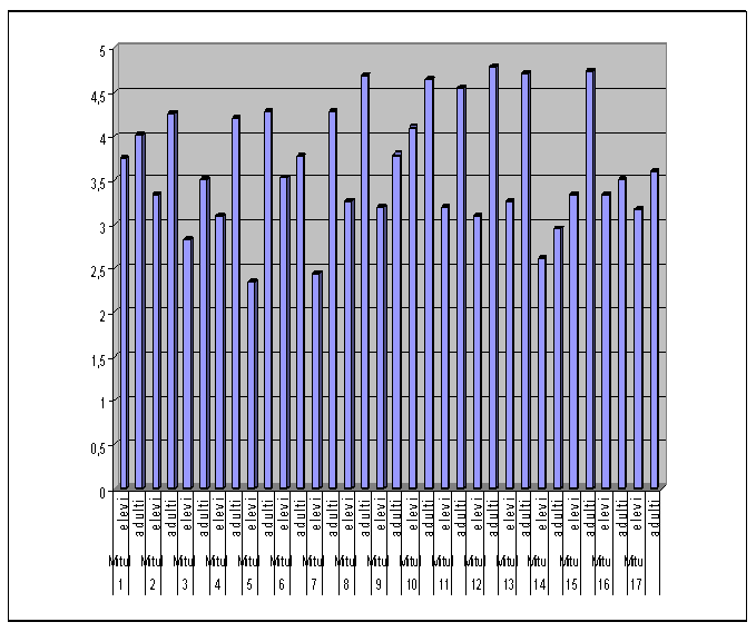 Din analiza graficului se observa la o analiza vizuala ca în gneral elevii au o aderenta mai redusa la miturile nationale românesti, lucru de înteles având în vedere diferentele în educatie.