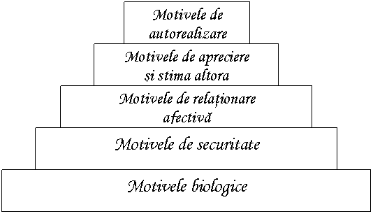 Psihologul american A.H. Maslow stabileste cinci categorii de motive pe care le ierarhizeaza în "piramida motivelor" din fig. 8