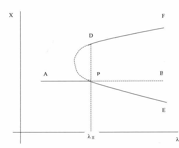 Īn punctul de bifurcatie P, traiectoria liniara AP se ramifica (devenind de fapt "traiectorie fuzzy"); legea negarii negatiei nu poate prezice cel mult propagarea liniara a dezvoltarii pe directia (instabila) PB.