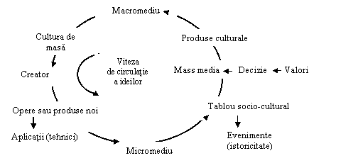 Cu alte cuvinte, exista creatori de mesaje, opera lor circula într-un anumit mediu, într-un microclimat ce reprezinta cadrul cotidian al maselor. Aceste mesaje se reîntorc prin atitudini si comportamente la creatori. Creatorii devin pentru mase un fel de referential.
