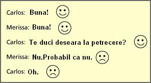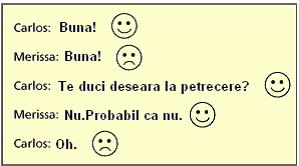 Ce poate fi spus despre aceasta discutie? Se poate spune ca cei doi participanti sunt bucurosi de a se vedea unul cu celalalt; Carlos asteapta cu nerabdare petrecerea, Merissa este dezamagita pentru ca ea nu poate participa, Carlos este si el dezamagit.