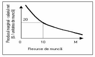 La un anumit moment si intr-un anumit stadiu de dezvoltare tehnologica, intre volumul resurselor de munca utilizate si volumul productiei se stabileste o anumita relatie. Potrivit legii randamentelor, fiecare unitate consumata din factorul de munca are o contributie din ce in ce mai mica la realizarea productiei[1]. In Figura 2.1 se observa ca, pentru cele 10 unitati de munca, salariul este de 20 $ / unitate.