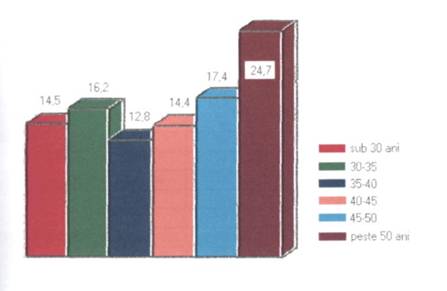 Dupa cum se poate observa în tabelul nr. 2.1. proportia salariatilor cu vârsta sub 30 de ani din aparatul propriu este de 17,1%, fata de 13,8% în unitatile teritoriale, ceea ce înseamna ca în aceste unitati tendinta de îmbatrânire a personalului este mai mare cu aproape cinci procente.
