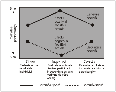 Împreuna, aceste doua efecte ale prezentei celorlalti - favorizarea performantei în cazul sarcinilor usoare si, respectiv, împiedicarea performantei în cazul celor dificile - poarta numele de facilitare sociala. Din pacate, aceasta denumire constituie o prima sursa de confuzie pentru foarte multi studenti. Important de retinut este faptul ca prezenta celorlalti faciliteaza raspunsul dominant, nu îndeplinirea sarcinii ca atare. Facilitarea raspunsului dominant faciliteaza îndeplinirea sarcinilor usoare, dar face ca sarcinile dificile sa fie si mai dificile.